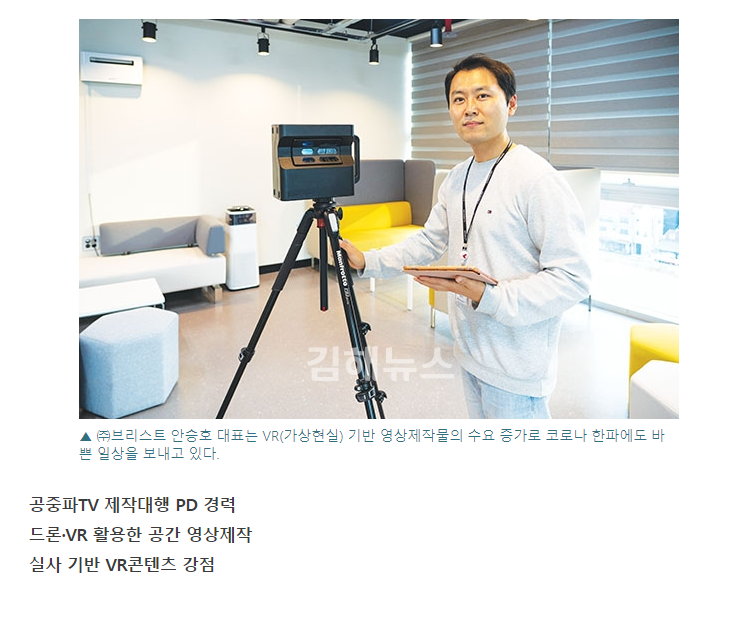 ㈜브리스트 안승호 대표는 영상을 '가치(Value)를 기록하는 작업'이라고 말한다. 그래서 그는 영상을 활용해 인물, 공간, 기업이 보여주지 않았던 가치를 찾아내 기록한다. 최근에는 공간의 가치 기록에 몰두하고 있다. 그는 존재했으나 우리들이 몰랐던 방식으로 공간을 재구성하고, VR기술을 활용해 입체적인 영상을 만들어 낸다. 때로는 사라지고 없어지는 것을 VR로 기록하기도 하고 공간 체험이 가능한 콘텐츠를 만들어 내기도 한다.